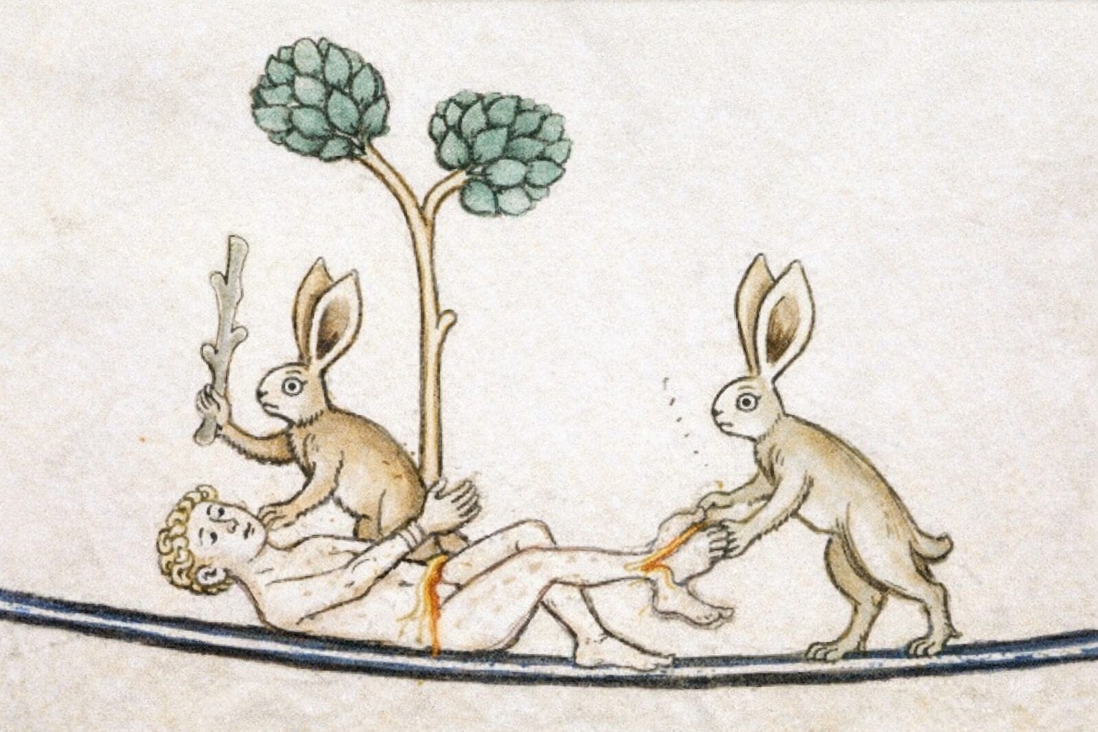 Tra le immagini più note vi sono quelle dei Smithfield Decretals, oggi conservati alla British Library**, dove compaiono conigli armati che assalgono uomini, trascinano cani da caccia, mettono in fuga i cacciatori. Non si tratta di un dettaglio isolato o di una fantasia estemporanea: scene analoghe ricorrono in diversi codici europei tra XIII e XIV secolo. Il motivo è abbastanza strutturato da far pensare a un vero e proprio codice figurativo.